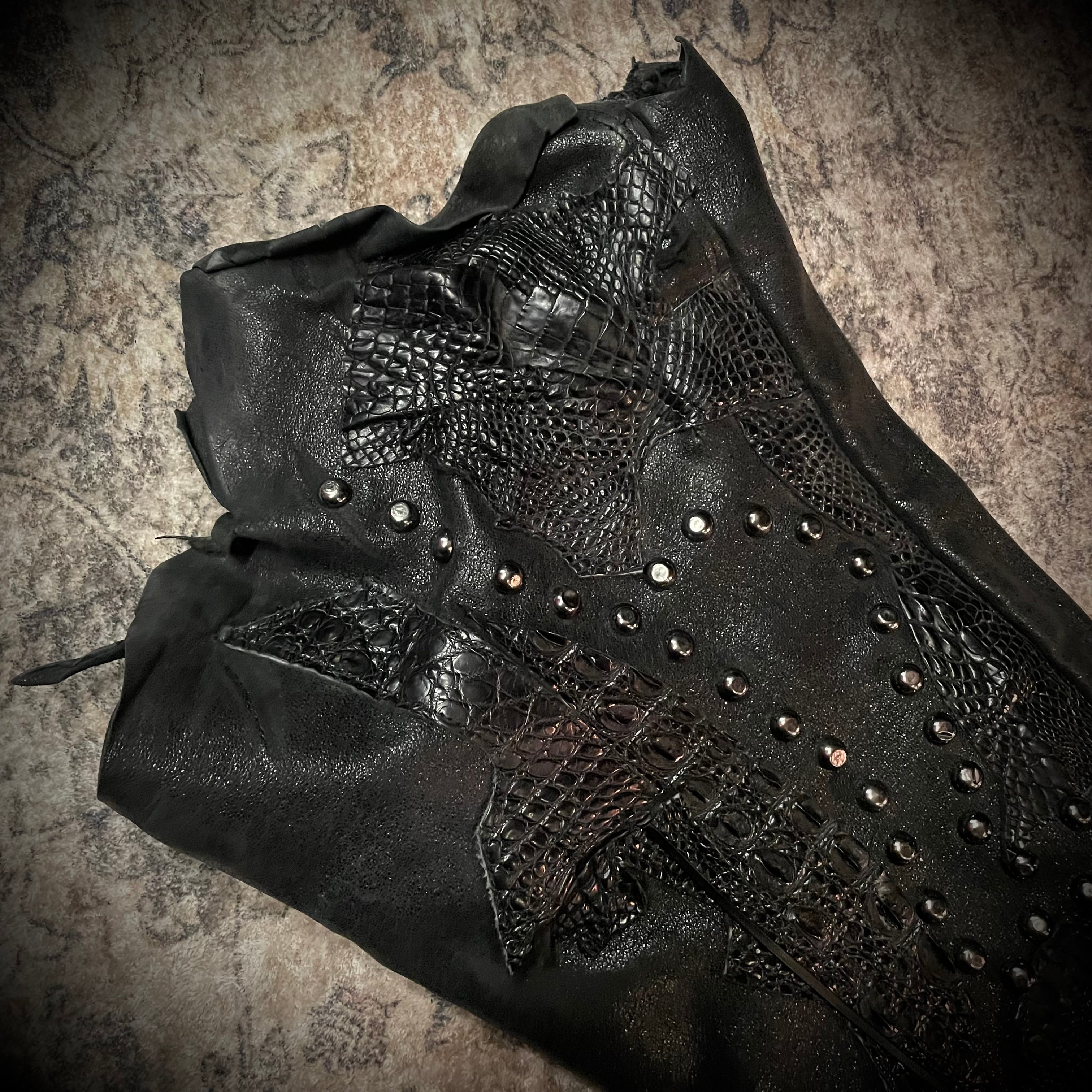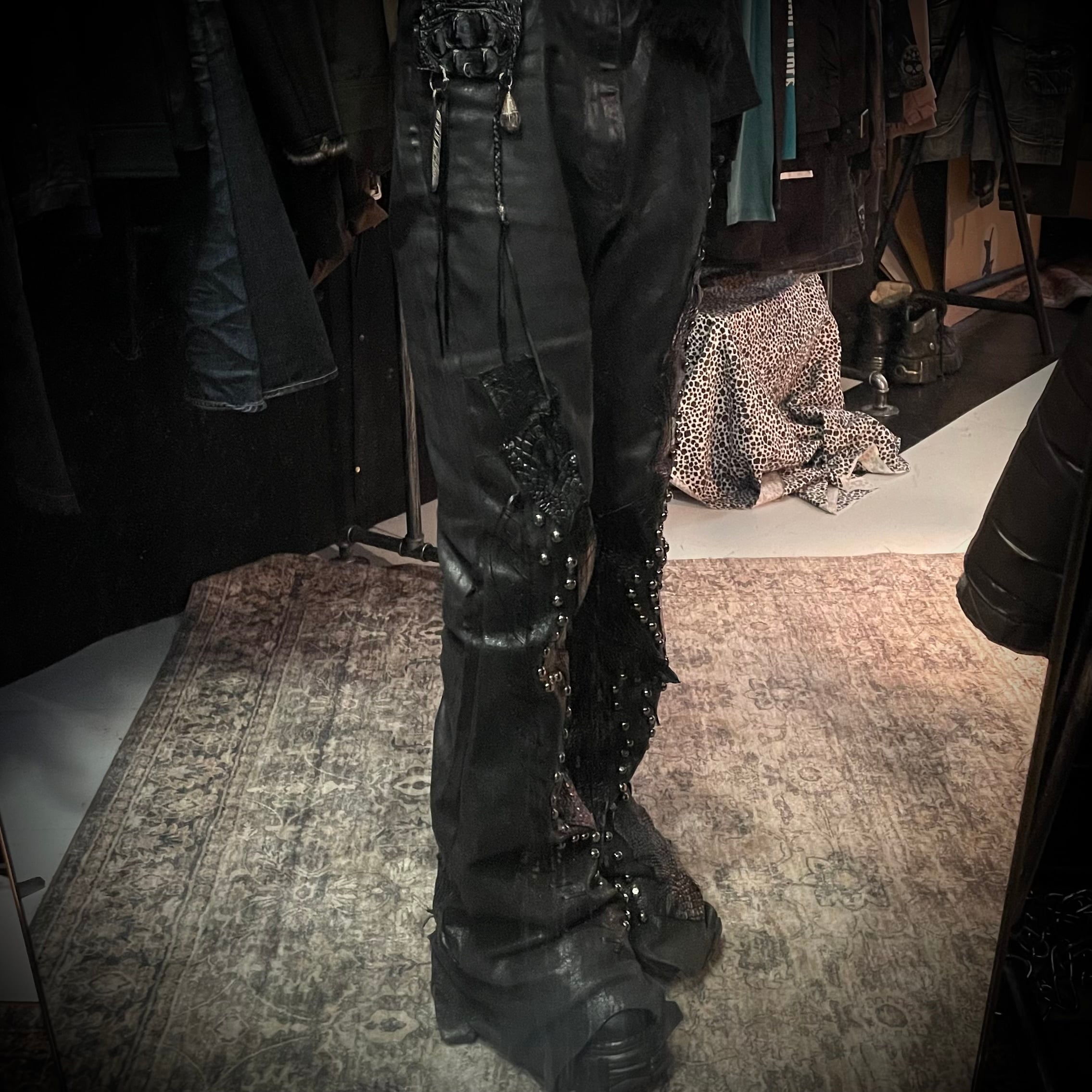 1VFUDIE Artisanal Studded Leather Patchwork Flare Pants
