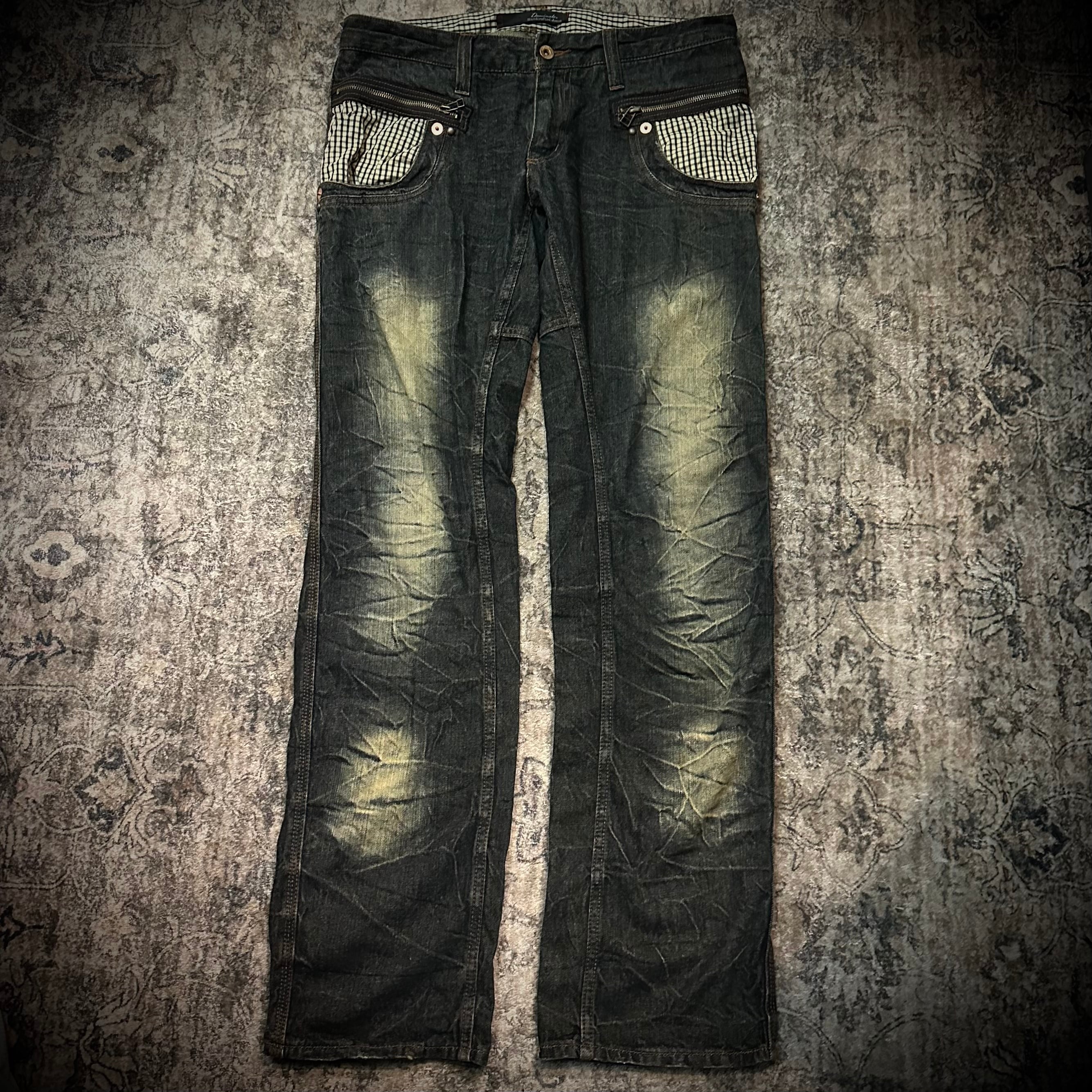 checked pocket faded flare denim